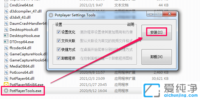 解压出来,运行里面的文件 设置优化.bat 。有些里面版本可以用 Potplayer Tools.exe 。
