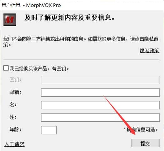 1、第一次启动会提示填写用户信息,请直接点击右下角的“提交”按钮
