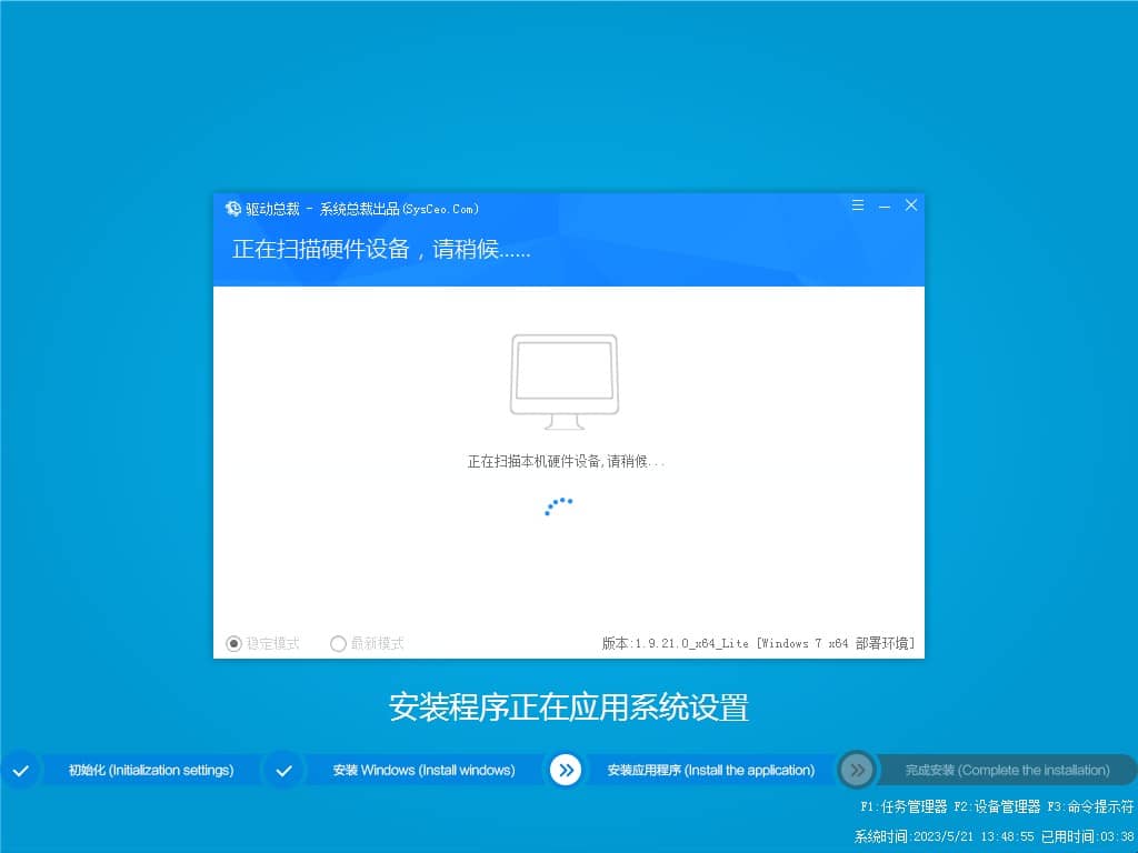 * 集成常见硬件驱动,智能识别+预解压技术,绝大多数硬件可以快速自动安装相应的驱动。
