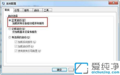 第二步:接着电脑就会弹出【系统配置】窗口,点击切换到【常规】,在【自动选择】下,勾选【正常启动】。