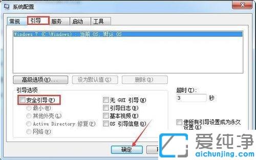 第三步:选择完成后,接着点击切换到【引导】,找到最下面的【引导选项】,勾选【安全引导】,点击【确定】。