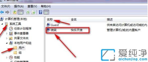 2.在计算机管理窗口下,如下图依次点击到【本地用户和组】-【用户】,右侧显示的就是你的用户名名称了。)