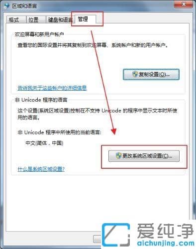 第四步:在【区域和语言】窗口中,点击切换到【管理】,点击右下角的【更改系统区域设置】。