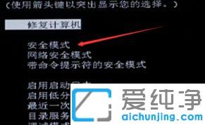 第二步:利用键盘上的方向键(上下左右箭头)选择【安全模式】,按回车键(enter)。