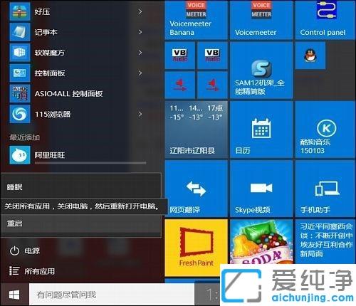 第四步:我们回到win10纯净版桌面,点击左下角的电源按钮,选择关机重启电脑。