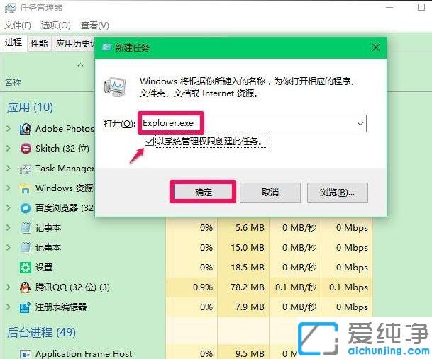第二步:在任务管理器窗口下,点击左上角的【文件】,在下拉菜单中点击【运行新任务(N)】。在【新建任务】的打开处输入:Explorer.exe,同时勾选下方的【以系统管理权限创建此任务】,最后点【确定】。现在win10系统的桌面图标应该已经恢复。