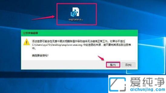 添加信息可能会在无意中更改或删除值并导致组件无法继续正常工作。如果你不信任C:\Users\xyz75\Desktop\explorer.exe.reg 中此信息的来源,请不要将其添加到注册表中。