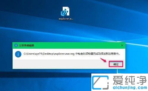 C:\Users\xyz75\Desktop\explorer.exe.reg 中包含的项和值已成功添加到注册表中。