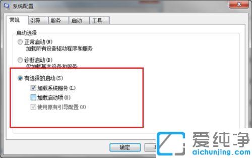 第二步:等win7纯净版弹出【系统配置】界面,点击常规项并找到【有选择的启动】,去掉【加载启动项】前面的勾选。