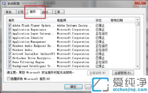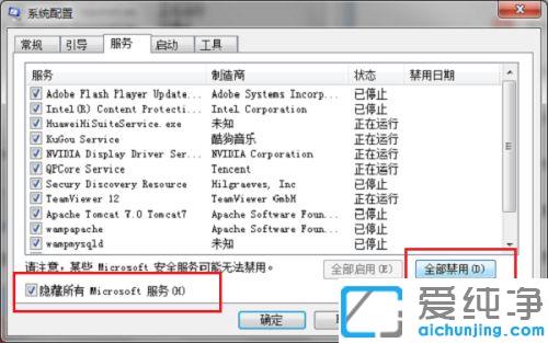 第四步:拉到最下面,勾选上【隐藏所有Microsoft服务】项,然后勾选上所有服务点击【全部禁用】。