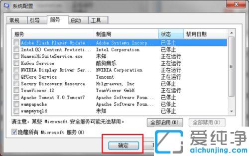 第五步:在当前窗口下,禁用掉除Microsoft服务的其它所有服务,点击下方的【确定】。