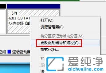 第二步:在打开的“计算机管理”窗口中,点击“磁盘管理”项,然后找到不能正常显示 的U盘盘符,右击选择“更改驱动器号和路径”;