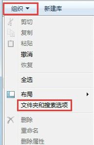第二步:点击“组织”按钮,并选择下拉项中的“文件夹和搜索选项”。