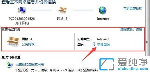第二步:在查看活动网络一栏中,点击打开【本地连接】窗口;