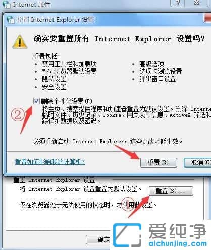 µÚÆß²½£º×îºóµã»÷¡¾ÖØÖá¿°´Å¥£¬²¢¹´Ñ¡¡¾É¾³ý¸öÐÔ»¯ÉèÖá¿Ñ¡Ïȷ¶¨ÖØÖÃInternet explorerÉèÖü´¿É¡£