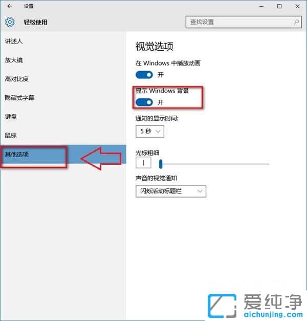 第二步:然后,在打开轻松使用界面后,在左侧列表中选择其他选项后在右侧视觉选项中开启显示windows背景选项,最后在选项开启之后桌面背景不再是黑色的即可自由设置背景图片了。