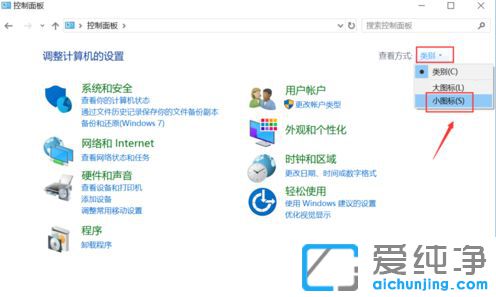 第三步:在控制面板主页,点击右上角的类别--小图标;