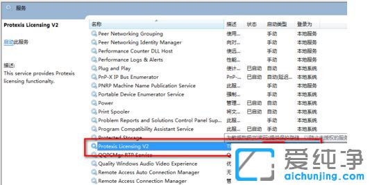 第三步:在“服务”的右边找到“Protexis Licensing V2”,双击打开。
