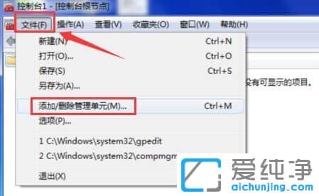 第二步:在窗口中,点击文件,选择添加/删除管理单元;