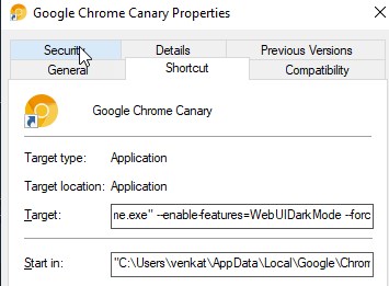 在“chrome.exe”之后的目标字段中添加 –enable-features=WebUIDarkMode –force-dark-mode字符串(请参见下面的截图)。