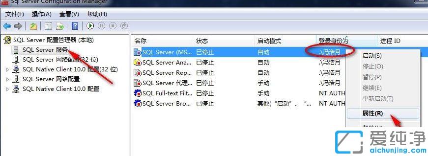 第三步:然后再点击【SQL Server服务】,在右侧的【登录身份为】处鼠标右击选择【属性】;