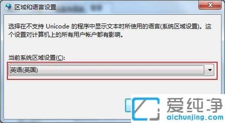 第五步:在弹出的窗口中将系统区域设置成【英语(英国)】,然后点击确定,重启后电脑显示就全是乱码,所以我们要记下从桌面到这个界面的位置和过程。