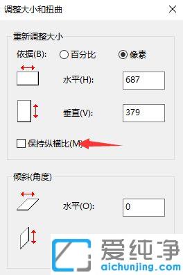 第四步:我们要修改分辨率的话,点击【像素】,去掉【保持横纵比】前面的勾选项。假如勾选的话,改变水平像素的同时,垂直像素会按照比例自动改变。同样改变垂直像素,水平像素也会随之改变,那我们就无法修改图片的像素了。