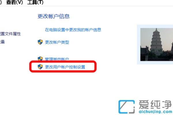 第二步:在win10纯净版的用户帐户窗口下,点击右侧的【更改用户帐户控制设置】。