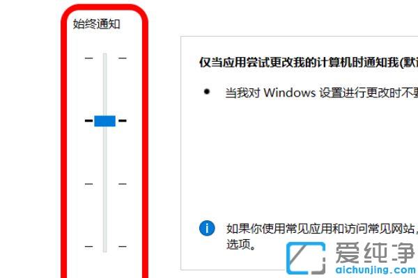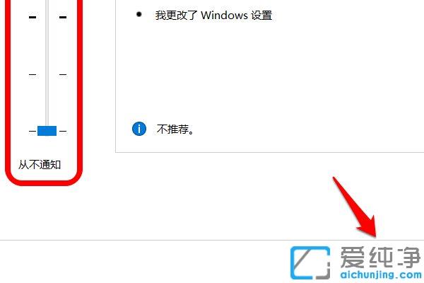 第四步:如果要关闭提示框,我们只要将滑动条移动到第一档,再点击【确定,】此时再打开或者安装安装软件就不会出现提示框了。