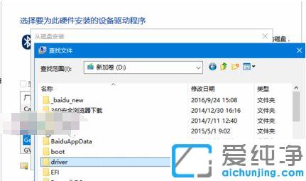 第六步:从磁盘安装窗口下,查找文件时定位到之前【下载好并解压的蓝牙驱动程序所在文件夹路径】。选择蓝牙驱动文件夹下面的*.inf格式的文件。