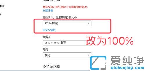 第三步:右侧我们找到【更改文本应用等项目的大小】项,鼠标下拉选择【100%】。