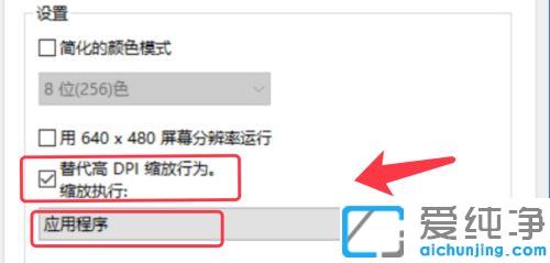 第七步:在设置下面,勾选上【替代高dpi缩放行为】,然后选择【应用程序】。