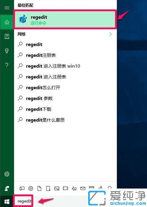第三步:返回到win10桌面的开始菜单,左下角的搜索栏中输入命令:regedit,点击【regedit运行命令】,打开【注册表编辑器】。注册表路径: