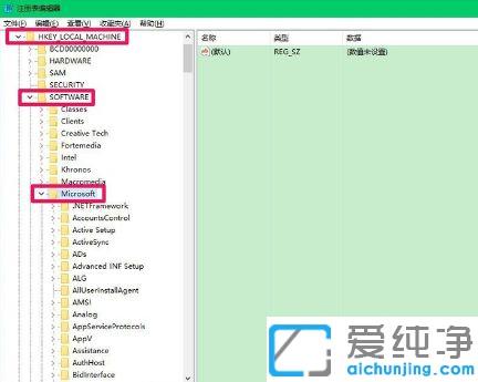 第四步:电脑打开注册表编辑器窗口后,如下图所示依次打开:【HKEY_Local_MACHINE】----【Software】--【Microsoft】。