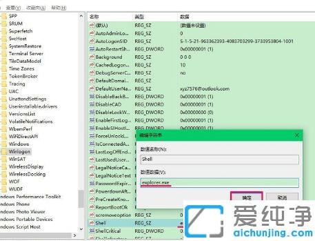 第七步:对应的右侧窗口,鼠标双击【Shell】。查看Shell的数值数据,如果是:explorer.exe,则是正确的,不用更改。如果不是,把数值数据更改为:explorer.exe(如还有其它字符,删除),再点击【确定】。