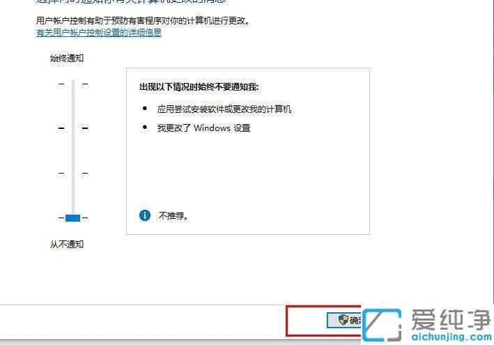 第三步:通过滑动条向下移动将控制信息更改为【从不通知】,点击下方的【确定】。