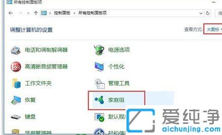 第二步:等win10系统弹出【控制面板】后,将左上角的【查看方式】更改为【大图标】。接着下拉找到并点击【家庭组】。