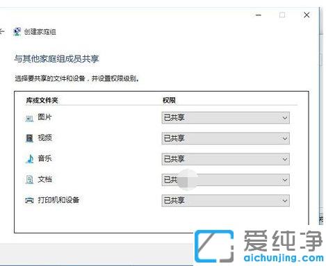 第四步:在下面的窗口中我们看到【与其他家庭组成员共享】下面有图片、视频等等选项,相对应右侧的权限下,将需要共享的内容设置为【已共享】,按提示点击【下一步】即可。