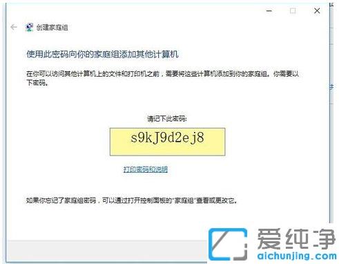 第五步:等【创建家庭组】完成后。电脑弹出以下内容,提示我们【请记下此密码】,其它的电脑可以通过输入此密码添加到本家庭组中。就可以实现文件夹共享功能了。