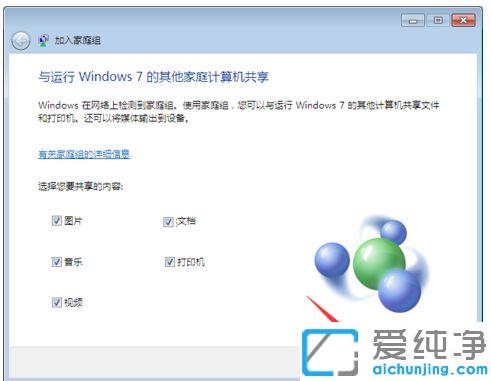 第七步:电脑进入到【加入家庭组】界面下,选择您要共享的内容。这里可以按照实际需要勾选共享的内容,然后点击【下一步】。