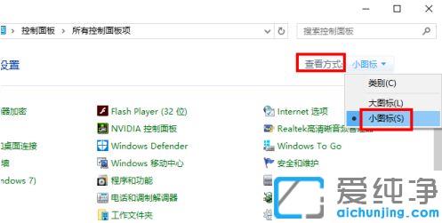 第二步:在win10系统控制面板界面,将右下角的【查看方式】通过下拉更改为【小图标】。