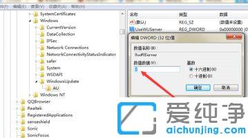 第六步:在当前窗口定位到WindowsUpdate下的【AU项】,右侧列表中找到【UseWUServer】这项,右键数据数值设置更改为0。