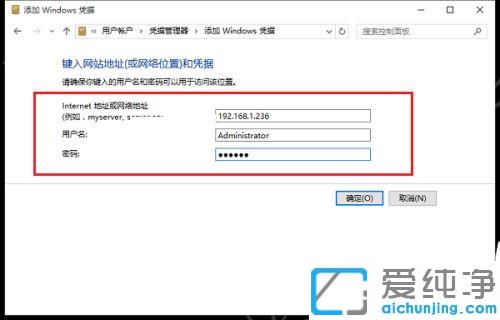 第四步:如下图所示,我们输入访问共享的打印机或者文件或者电脑所在的电脑ip地址,电脑用户名和密码。然后点击【确定】。平时局域网内访问共享时需要的网络凭据就在这里添加。