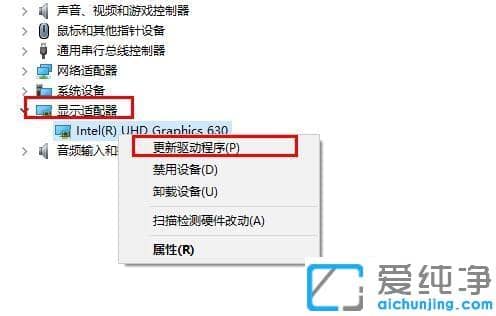 第三步:接着点击右侧任务栏【显示适配器】,下拉后右键选择【更新驱动程序】。