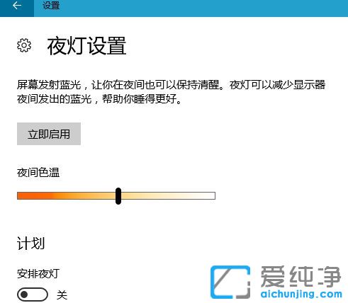 第四步:点击夜灯开关下方的夜灯设置链接按钮,可以进入夜灯设置界面。点击立即启用按钮,可以看到屏幕立即变成昏黄的颜色,这种配色下,蓝光更少,可以让眼睛不至于过度疲劳。