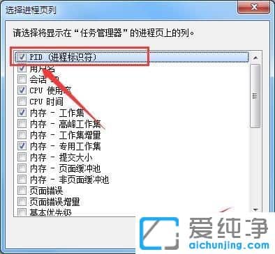 第四步:在弹出的窗口中,勾选“PID(进程标识符)”选项,点击确定保存设置;