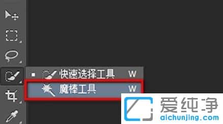 第五步:在ps软件左侧的工具栏中找到【快速选择工具】的图标,点击鼠标左键,长按该图标,在菜单中点击选择【魔棒工具】。如图: