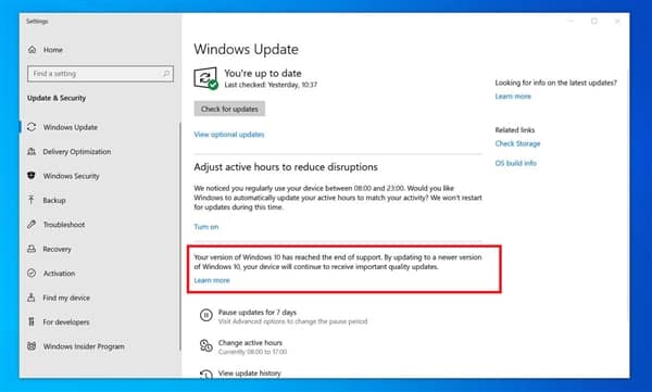 这项通知出现在Windows Update界面,会显示“您的Windows 10版本已终止支持。通过更新到Windows 10的较新版本,您的设备将继续收到重要的质量更新。”
